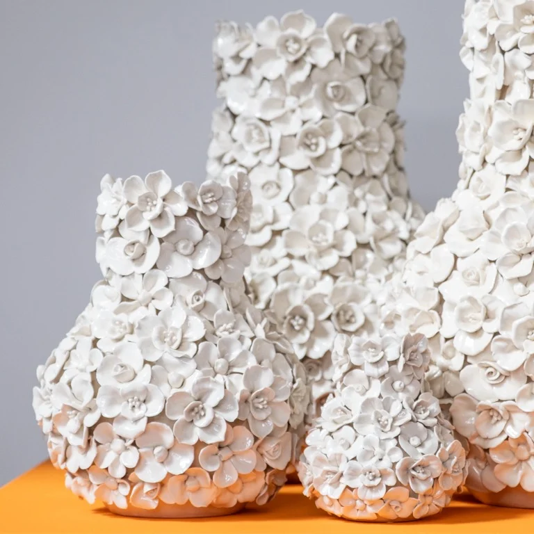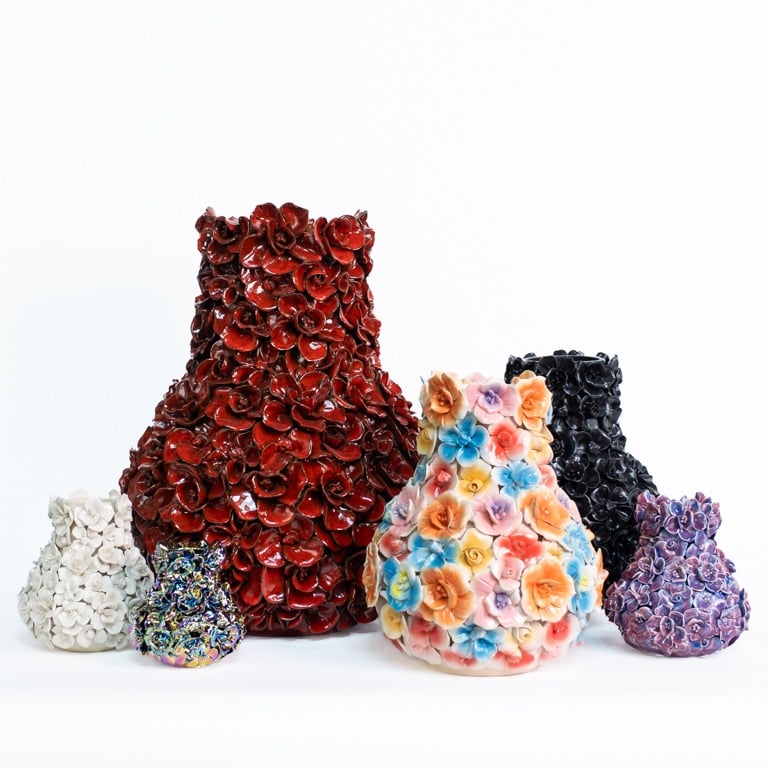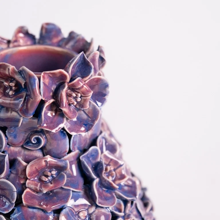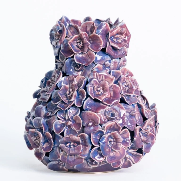 De klassieker van Des Pots! De bloemetjes vazen in verschillende (nieuwe) kleuren en diverse maten. Blijft een schoonheid! Roze, groen, lichtblauw, blauw, gekleurd, wit, goud en metallic, rood, zwart en paars, allemaal mooie kleuren. Prachtige handgemaakte vazen.